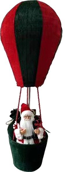 Χριστουγεννιάτικο διακοσμητικό με τον Άγιο Βασίλη σε αερόστατο, διακοσμημένο με κόκκινο και πράσινο ύφασμα. Ο Άγιος Βασίλης βρίσκεται μέσα στο καλάθι του αερόστατου, κρατώντας έναν σάκο με δώρα, έτοιμος για το γιορτινό του ταξίδι. Η εναλλαγή των χρωμάτων προσδίδει μια κλασική και γιορτινή αίσθηση στη διακόσμηση. Ιδανικό για όσους θέλουν μια πρωτότυπη και εορταστική πινελιά στις γιορτές.
