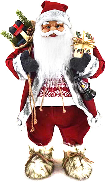 Χριστουγεννιάτικο διακοσμητικό με φιγούρα Άγιου Βασίλη σε κλασικό κόκκινο και λευκό χρώμα, με παραδοσιακή εμφάνιση και ρουστίκ λεπτομέρειες. Ο Άγιος Βασίλης φοράει μάλλινη ζακέτα με σχέδιο, γούνινες μπότες και κρατάει έναν σάκο γεμάτο δώρα και πράσινα κλαδιά στον ώμο. Στο άλλο χέρι κρατάει ένα μικρό δώρο και ένα φαναράκι, προσθέτοντας μια ζεστή και παραδοσιακή αίσθηση. Αυτό το διακοσμητικό είναι ιδανικό για να δώσει μια αυθεντική χριστουγεννιάτικη ατμόσφαιρα στο χώρο.