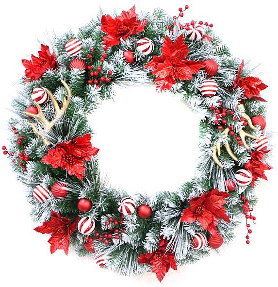 Χριστουγεννιάτικο στεφάνι με πλούσια διακόσμηση από κόκκινα και λευκά στοιχεία. Περιλαμβάνει χιονισμένα πράσινα κλαδιά, κόκκινα φύλλα, μπάλες με ρίγες, μικρά κλαδάκια με μούρα και διακοσμητικά κέρατα. Το στεφάνι συνδυάζει κλασικά χρώματα και δημιουργεί μια ζεστή, γιορτινή ατμόσφαιρα, ιδανική για την είσοδο ή το καθιστικό.