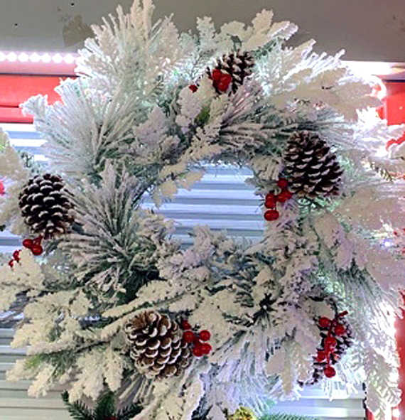 Χριστουγεννιάτικο στεφάνι με χιονισμένα κλαδιά, που περιλαμβάνει μεγάλα κουκουνάρια και κόκκινα μούρα, προσδίδοντας μια φυσική και χειμωνιάτικη αίσθηση. Η χιονισμένη όψη των κλαδιών δημιουργεί μια ατμόσφαιρα ζεστασιάς και ομορφιάς. Ιδανικό για την είσοδο ή το καθιστικό, αυτό το στεφάνι φέρνει τη μαγεία του χειμώνα στη χριστουγεννιάτικη διακόσμηση.