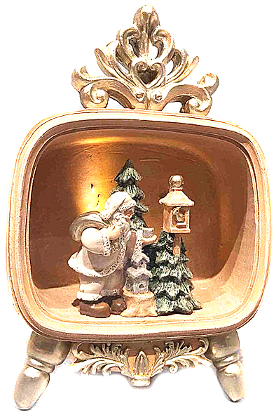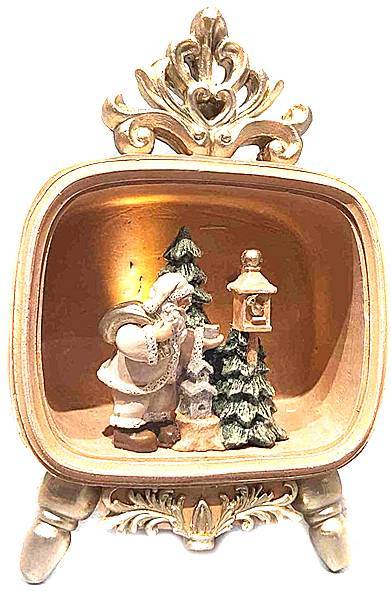 Μοναδικό χριστουγεννιάτικο διακοσμητικό σε ρετρό τηλεόραση, που απεικονίζει τον Άγιο Βασίλη με το σακί του μπροστά από χιονισμένα δέντρα και φαναράκι. Διαθέτει φωτισμό που δημιουργεί μια ζεστή, γιορτινή ατμόσφαιρα, προσδίδοντας ρετρό κομψότητα στη χριστουγεννιάτικη διακόσμηση. Ιδανικό για τοποθέτηση σε ράφι ή τραπεζάκι, προσθέτει μια vintage νότα στο χώρο σας.