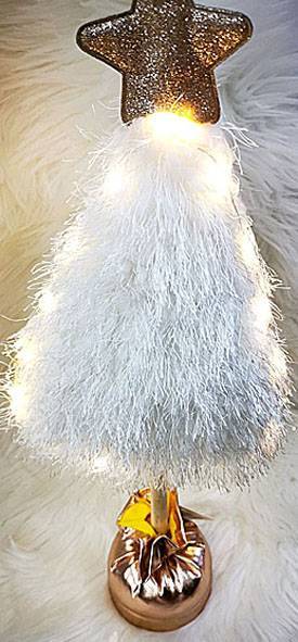 Εντυπωσιακό χριστουγεννιάτικο διακοσμητικό δέντρο ύψους 48εκ., στολισμένο με φωτισμό LED που αναδεικνύει τη χνουδωτή του υφή και προσδίδει μια μαγική αίσθηση στον χώρο. Στην κορυφή δεσπόζει ένα λαμπερό χρυσό αστέρι, κάνοντας αυτό το δέντρο ιδανικό για να στολίσει κάθε γωνιά με εορταστική λάμψη. Μια κομψή και ιδιαίτερη προσθήκη για τη χριστουγεννιάτικη διακόσμηση του σπιτιού σας.