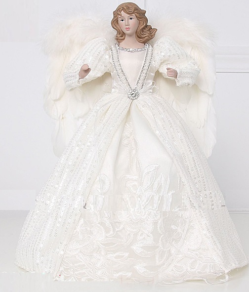 Ένα πανέμορφο χριστουγεννιάτικο διακοσμητικό άγγελου, ιδανικό για να δώσει μια αίσθηση αγνότητας και γαλήνης στη γιορτινή διακόσμηση. Ο άγγελος είναι ντυμένος με ένα εντυπωσιακό, λευκό φόρεμα, διακοσμημένο με περίτεχνα κεντήματα και παγιέτες που λάμπουν διακριτικά στο φως. Το φόρεμά του συμπληρώνουν τα λευκά, αφράτα φτερά, δημιουργώντας μια αιθέρια και μαγευτική αίσθηση. Ιδανικός για το στολισμό του χριστουγεννιάτικου δέντρου ή ως κεντρικό διακοσμητικό στοιχείο στο τραπέζι.