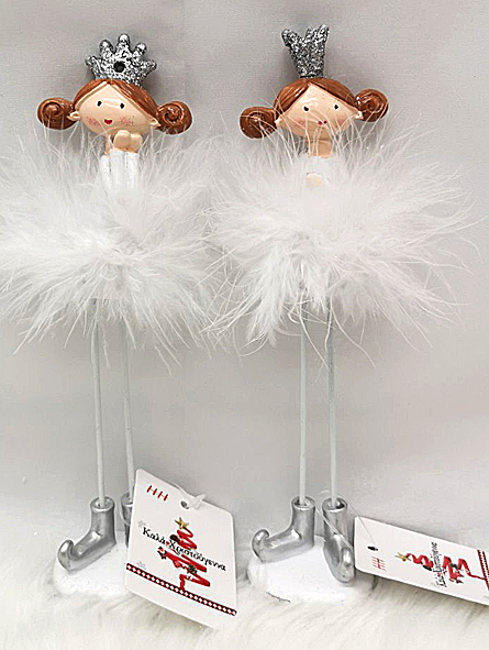Χαριτωμένο χριστουγεννιάτικο διακοσμητικό σε μορφή μικρής πριγκίπισσας που θα προσθέσει παιχνιδιάρικο χαρακτήρα στη διακόσμησή σας. Η πριγκίπισσα φοράει μια ασημένια κορώνα και μια λευκή φουντωτή φούστα από απαλά φτερά, δημιουργώντας μια όμορφη και τρυφερή αίσθηση. Με το λεπτό της σώμα και τη γλυκιά έκφραση, είναι ιδανική για τοποθέτηση στο χριστουγεννιάτικο δέντρο, στο τραπέζι ή ως στολίδι σε οποιονδήποτε χώρο του σπιτιού σας.