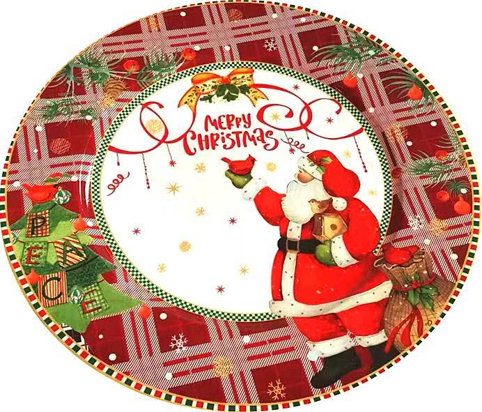 Αυτή η χριστουγεννιάτικη πιατέλα διαμέτρου 23 εκατοστών είναι διακοσμημένη με χαρούμενο σχέδιο του Άγιου Βασίλη και το μήνυμα "Merry Christmas". Το κόκκινο καρό φόντο και οι λεπτομέρειες από γιορτινά στολίδια, κλαδιά και πουλάκια την καθιστούν ιδανική για να σερβίρετε χριστουγεννιάτικα γλυκίσματα ή φρούτα, ενώ προσθέτει μια γιορτινή νότα στο τραπέζι σας. Κατάλληλη για να δώσει χρώμα και χαρά στις γιορτές σας.