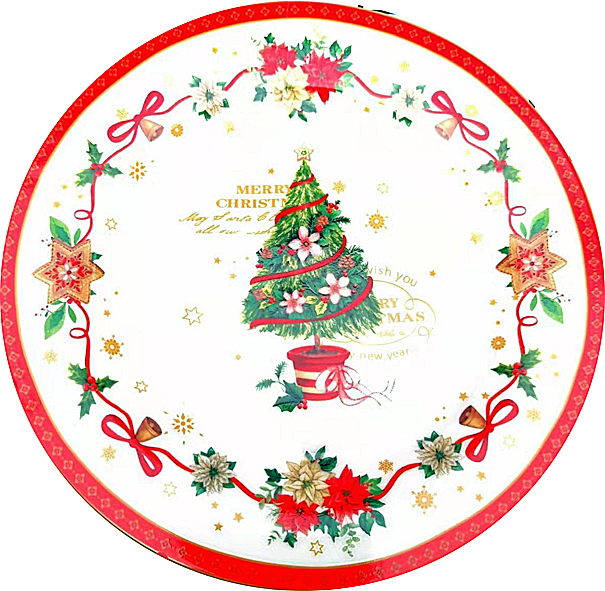Δημιουργήστε μια μαγευτική γιορτινή ατμόσφαιρα με αυτή τη χριστουγεννιάτικη πιατέλα διαμέτρου 35 εκατοστών! Το σχέδιο της περιλαμβάνει ένα καλαίσθητο χριστουγεννιάτικο δέντρο, πλαισιωμένο από ζωντανά αλεξανδρινά λουλούδια, κόκκινες κορδέλες και χρυσές λεπτομέρειες που αποπνέουν ζεστασιά και πολυτέλεια. Αυτή η πιατέλα είναι ιδανική για να παρουσιάσετε τα γιορτινά σας γλυκίσματα ή ως διακοσμητικό κομμάτι που θα τραβήξει όλα τα βλέμματα στο χριστουγεννιάτικο τραπέζι σας. Προσθέστε αυτό το κομψό στοιχείο στη συλλογή σας και χαρίστε μοναδικό στιλ στις γιορτές σας.