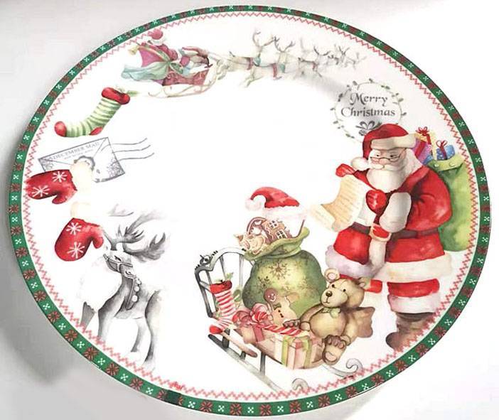 Αναβαθμίστε τη χριστουγεννιάτικη διακόσμηση του τραπεζιού σας με αυτή την πιατέλα διαμέτρου 23εκ. Διακοσμημένη με τον Άγιο Βασίλη, ταράνδους και γιορτινά μοτίβα, σε αποχρώσεις κόκκινου και πράσινου, αυτή η πιατέλα είναι ιδανική για να σερβίρετε λιχουδιές και γλυκά. Ένα ξεχωριστό κομμάτι που θα προσθέσει μαγεία στις γιορτινές σας συγκεντρώσεις!
