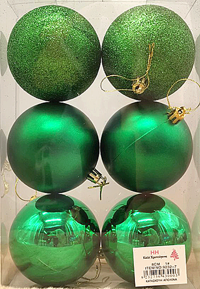 Προσθέστε φυσική γοητεία στο χριστουγεννιάτικο δέντρο σας με αυτό το σετ από 6 πράσινες μπάλες. Το σετ περιλαμβάνει μπάλες σε τρεις φινιρίσματα: ματ, γυαλιστερές και με γκλίτερ, για να δημιουργήσετε ένα κομψό και εορταστικό αποτέλεσμα. Ιδανικό για κλασικό ή μοντέρνο στολισμό.