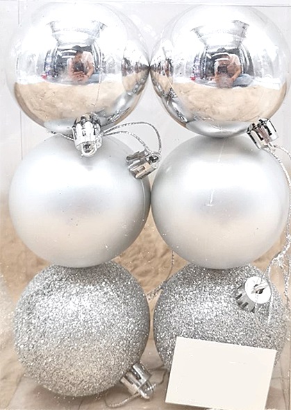 Προσθέστε μια κομψή και λαμπερή πινελιά στο χριστουγεννιάτικο δέντρο σας με αυτό το σετ από 6 ασημί μπάλες διαμέτρου 6 cm, που περιλαμβάνουν φινιρίσματα γυαλιστερά, ματ και glitter. Το ασημί χρώμα προσδίδει μια αίσθηση πολυτέλειας και μοντέρνου στυλ, κάνοντάς το ιδανικό για κάθε γιορτινή διακόσμηση. Είναι κατασκευασμένες για να προσφέρουν αντοχή και ασφαλή στολίσματα στον χώρο σας.