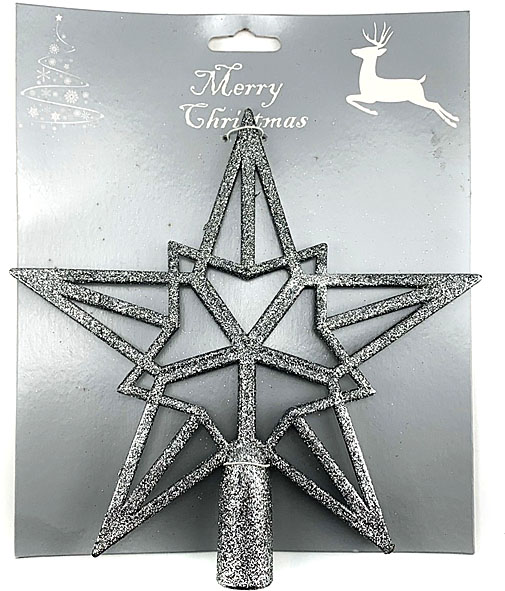 Προσθέστε μια μοναδική λάμψη στο χριστουγεννιάτικο δέντρο σας με αυτή την ασημί κορυφή αστεριού, σχεδιασμένη για να ξεχωρίζει. Με μοντέρνο και γεωμετρικό σχέδιο, αυτή η κορυφή προσφέρει μια κομψή και πρωτότυπη νότα στη διακόσμηση σας. Η επικάλυψη με glitter χαρίζει λάμψη και δημιουργεί μια ατμόσφαιρα γιορτινής μαγείας, ιδανική για να ολοκληρώσει την εμφάνιση του δέντρου σας.