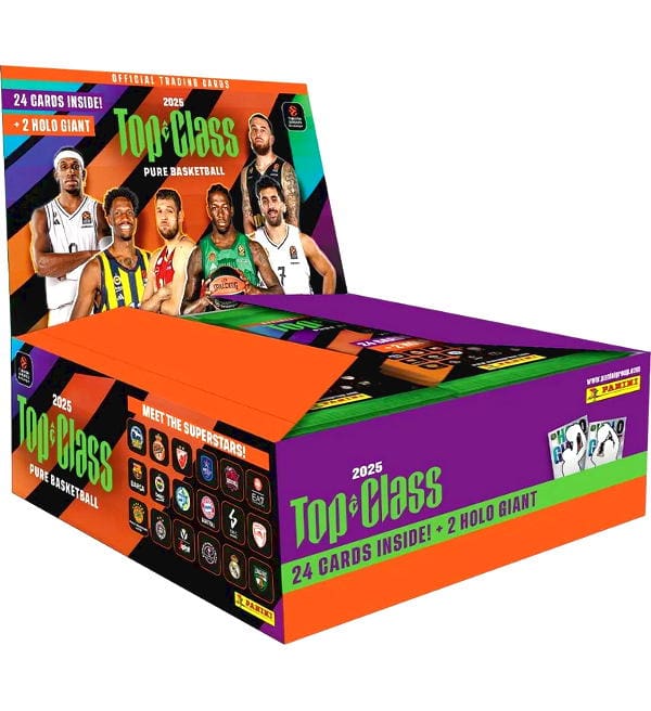 1 Κουτί με 10 φακελάκια για τη συλλογή καρτών Panini Turkish Airlines EuroLeague Top Class 2025. Κάθε φακελάκι περιέχει 24 κάρτες και 2 Holo Giant κάρτες.